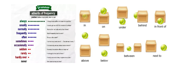 下面两个图,分别采用图示的方法,讲清楚了关于频率方面的副词,以及关于位置方面的介词应该如何使用,看完之后,是不是让你对这些单词的使用方法一目了然?